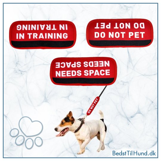 En nem advarsel til jeres omgivelser. Skiltet sættes let på hundesnoren med velcro . Der er tekst på to sider.