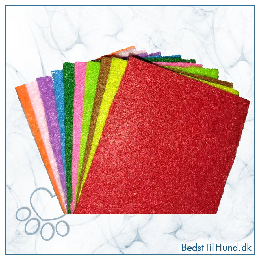 En pakke består af 10 ark filt, der hver måler ca. 7,5 x 5 cm. Der er samme farver i alle poser.