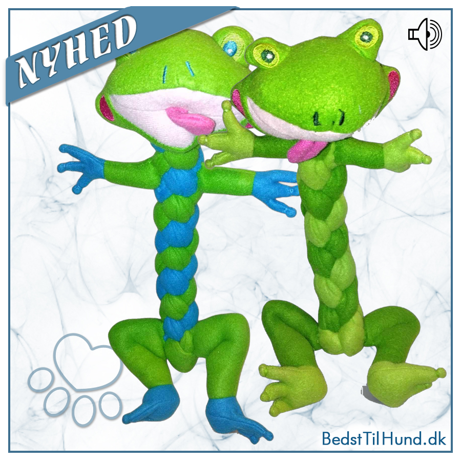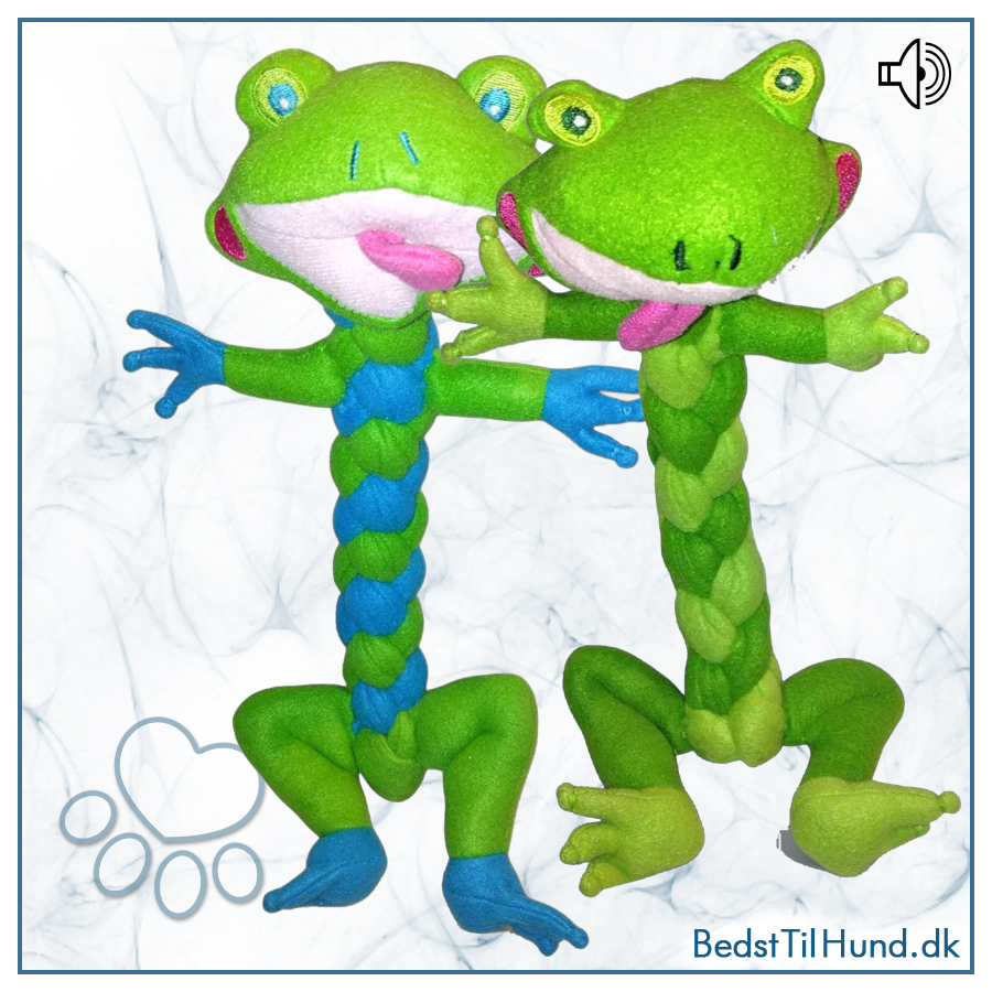 Skøn frø lavet i flettet fleece. Den har kun bamseblod (fyld) hovedet hvor der også er et piv, for en sjovere leg. Det er en sjov bamse for hunden. Den er god at ligge og hygge med, men også til mere vilde rusketure. Perfekt til hvalpe!