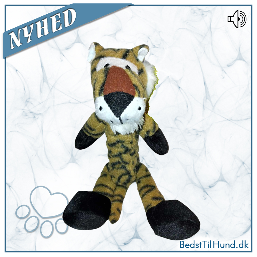 Skøn Tiger lavet i flettet fleece. Den har kun bamseblod (fyld) hovedet hvor der også er et piv, for en sjovere leg. Det er en sjov bamse for hunden. Den er god at ligge og hygge med, men også til mere vilde rusketure. Perfekt til hvalpe! Tigerens krop er flettet/knyttet meget hård så den er helt stiv mens benene og hovedet er bløde.