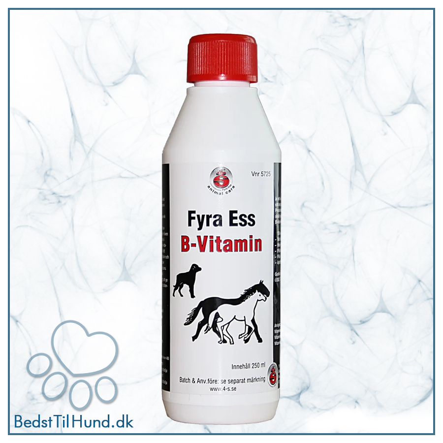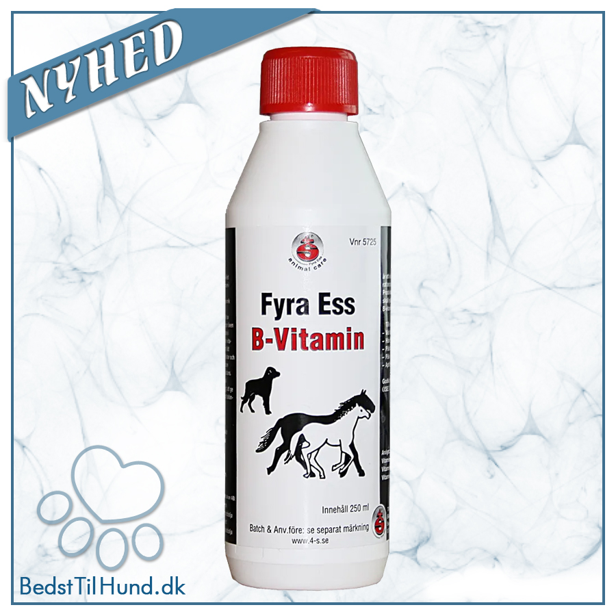 Fyra Ess B-vitamin er et velsmagende B-vitaminkoncentrat tilpasset heste og hunde. Produktet er et fodertilskud, der bør gives i det daglige foder, når B-vitamin anses for nødvendigt. For eksempel: tør og livløs pels, hård og krævende motion og appetitløshed Fyra Ess B-vitamin er særligt rig på B1-vitamin, som blandt andet påvirker funktionen af individets muskler. B6-vitamin gives ekstra sammen med proteinrigt foder og under drægtighed. B12 er integreret i dannelsen af blodlegemer. Vitaminerne bidrager også til en velfungerende mikroflora i dyrets tyktarm. De inkluderede vitaminer er velafbalancerede, så de let kan doseres for at imødekomme alle hestes og hundes behov, og er desuden blandet i et velsmagende bærestof. B-vitaminerne kan ikke lagres i kroppen. Det er derfor vigtigt at sørge for en jævn, kontinuerlig og afbalanceret tilførsel.