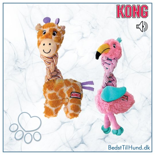 KONG Knots Twists pink flamingo eller sjov giraf med flettet rebhals og piv i kroppen. Dyrene er fra den kendte Knots serie, hvor bamseblodet er erstattet med reb.