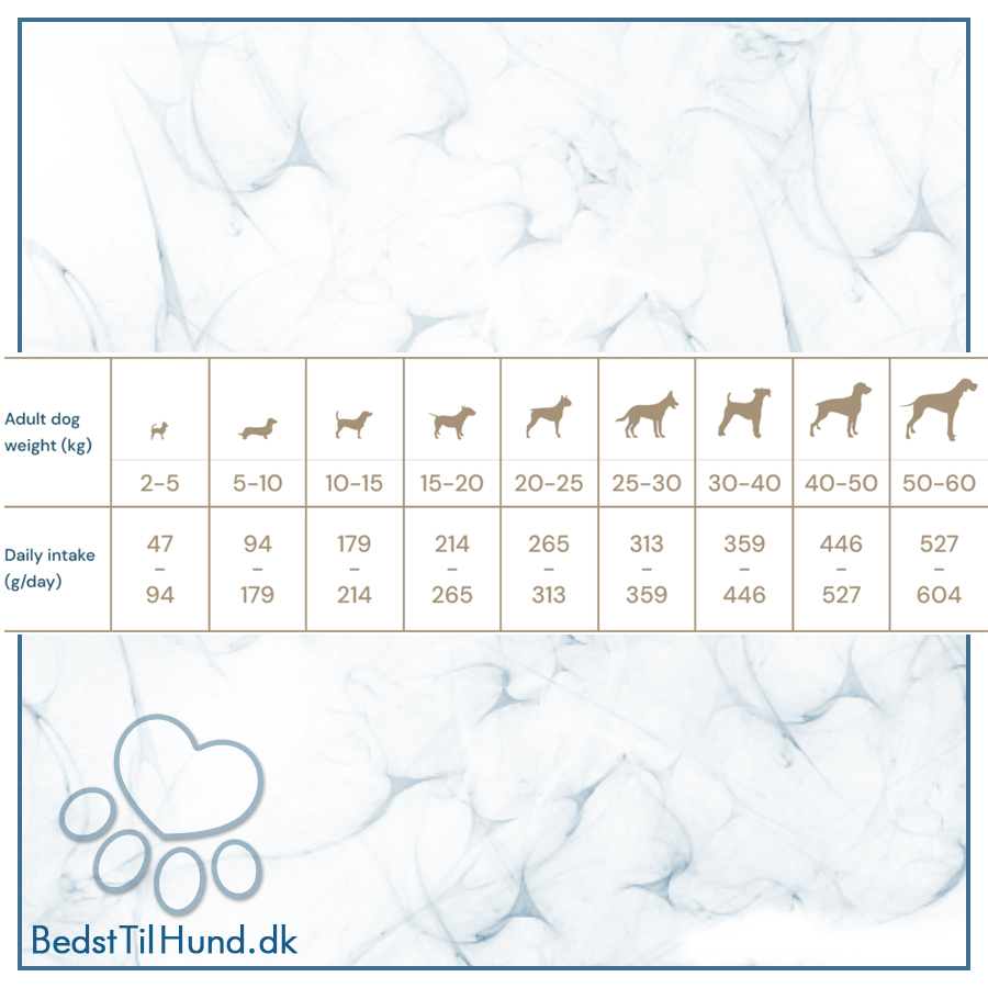Råprotein 25%, Råfedt 14%, Råaske 8,50%, Råfiber 2,20%, Calcium 2,10%, Fosfor 1,15%, Omega 3 0,26%, Omega 6 1,26%.
