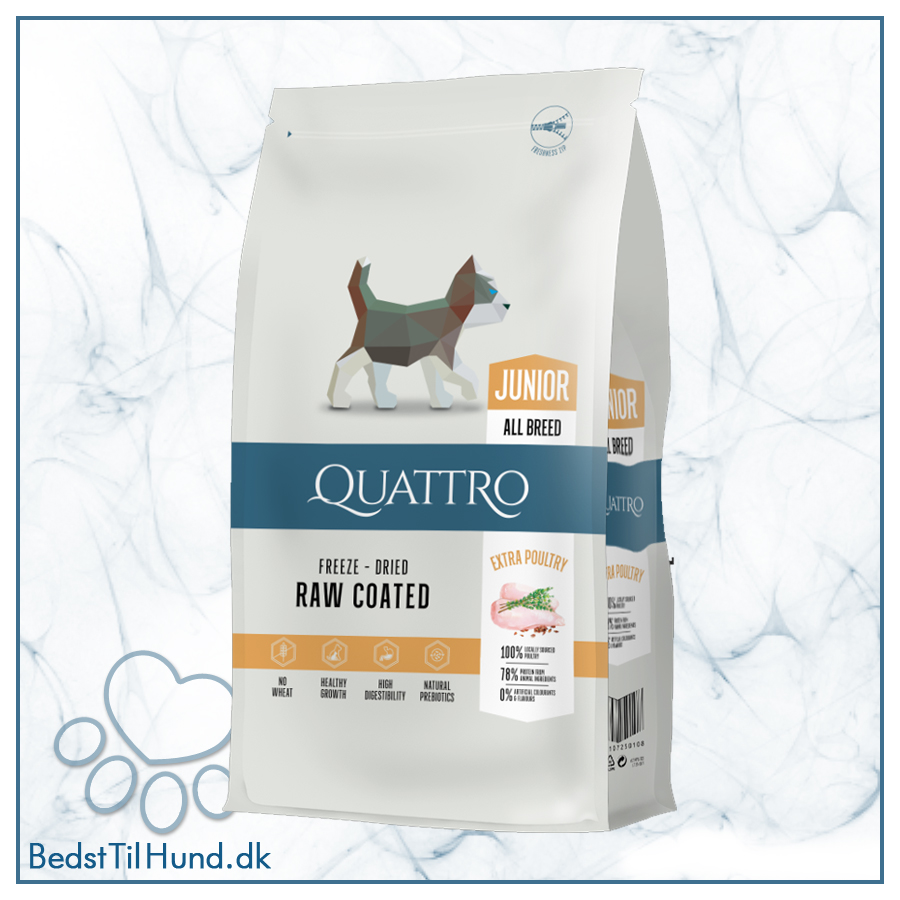 Quattro Super Premium All Breed Junior, Extra Poultry, er et Super Premium foder, der giver din hvalp de bedste forudsætninger for et sundt og langt liv. Quattro Puppy er velegnet til hvalpe af alle racer i alderen 2-18 måneder. Foderkuglerne er dækket med frysetørret kylling, som bevarer den naturlige og velsmagende smag, der også tilfredsstiller selv de mest kræsne hvalpe.