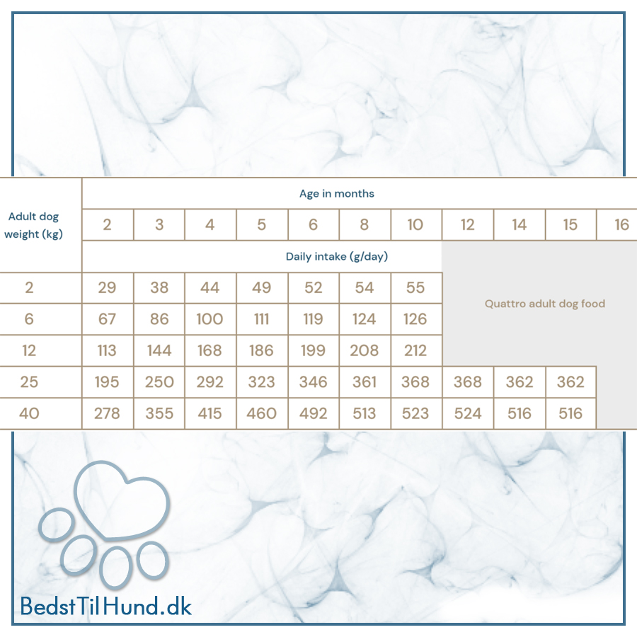 Server maden tør. Frisk vand skal være tilgængeligt hele tiden. Indfør nye produkter gradvist, i det mindste over 5 dage med stigende daglig dosis af Quattro, indtil hvaæpen er helt ovre på Quattro.
