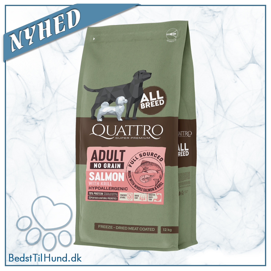 Quattro Super Premium No Grain All Breed Adult, Salmon & Krill er et kornfrit Super Premium foder til voksne hunde i alle størrelser, baseret på laks og krill som hovedkilder til animalsk protein. Foderkuglerne er belagt med frysetørret kød, hvilket bevarer naturlige næringsstoffer og giver en uimodståelig smag, som selv de mest kræsne hunde vil elske.