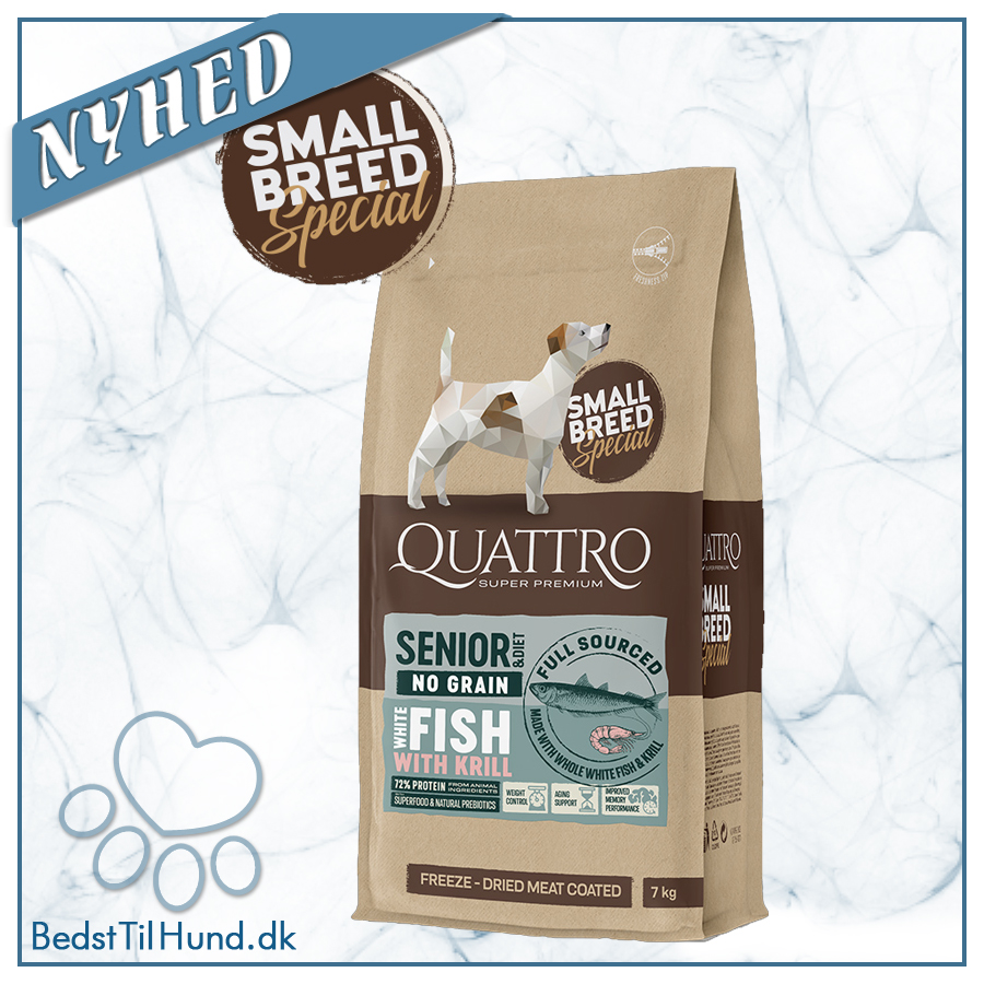 Quattro Super Premium Senior/diet foder til små hunde, uden korn med hvid fisk og krill. Til seniorhunde og til hunde med tendens til at tage på i vægt.