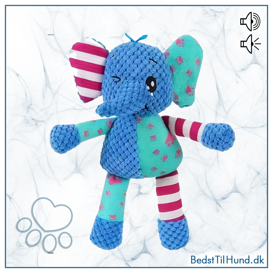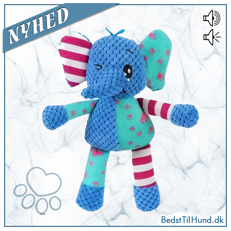 Skøn elefant i lækkert design med mange fine detaljer. Bamsen har både piv og knas for en sjovere leg. Elefanten er blød, slasket og indbyder til hygge. Den er ikke til hunde der er hårde ved deres legetøj. Alle detaljer er selvfølgelig broderet på.